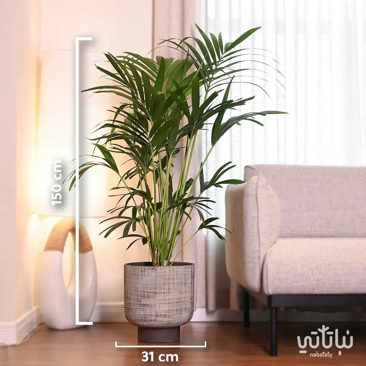 بجمال أوراقها الريشية الخضراء التي تنبض بالحيوية، تأتي نبتة الكينتيا الكبيرة لتضفي لمسة من الفخامة الطبيعية على أي مساحة داخلية. في حوض أسمنتي أنيق بلونه الرمادي، فتجمع بين الحداثة والهدوء في تصميم واحد.